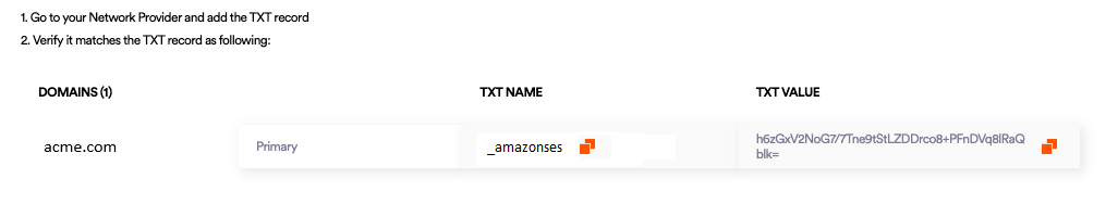 The "Add TXT Records" dialog box opens. This dialog box includes the TXT record names and TXT record values, that you'll need in order to add and verify the TXT records for your domain - in the next step.