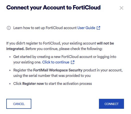About connecting FortiMail Workspace Security with FortiCloud - existing integrations