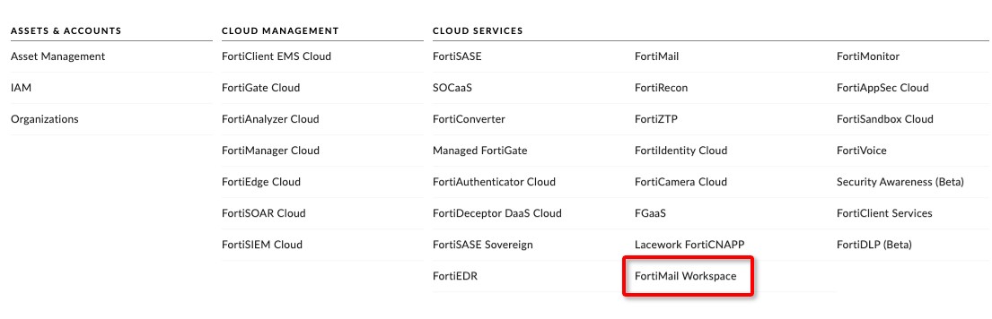 FortiCloud gives you one-stop access to all your Fortinet cloud services - including FortiMail Workspace Security and its associated assets. To access these assets, you'll need to: