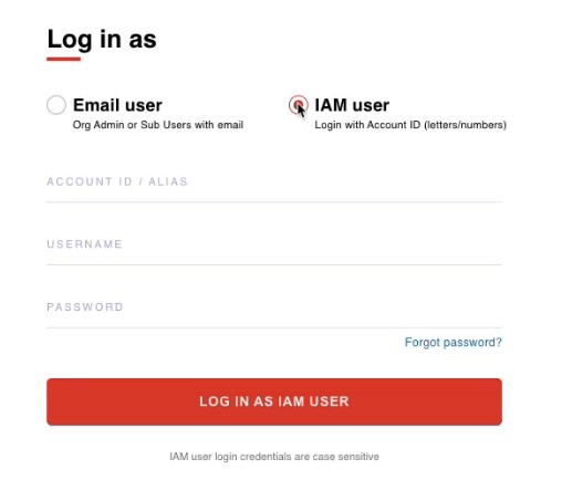 The log-in procedure varies depending on whether you are an "email" [master] user or an "IAM" user: