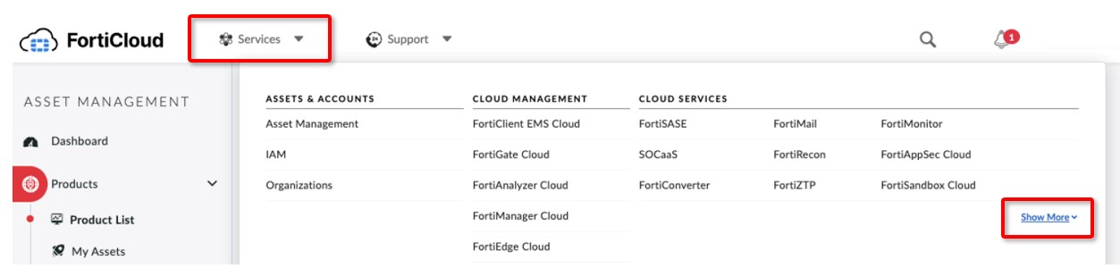 In FortiCloud, on the right of the FortiCloud header, click Services, and then click "Show More", on the right-side.