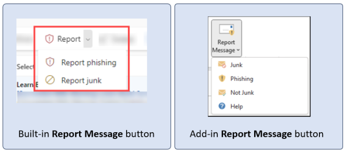 The Microsoft built-in and add-in "Report Message" buttons enable end-users to report phishing and suspicious email in Outlook, that is, to report an email message that they think may be junk or phishing. They can also report an email as being "not junk" - that is, a false positive [clean].