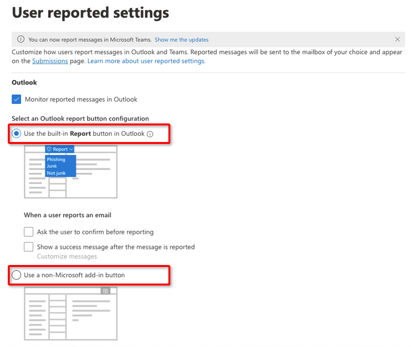Click here [https://security.microsoft.com/securitysettings/userSubmission] to open the Microsoft User reported settings page, and then select if you want to use the built-in reporting functionality or the add-in option.