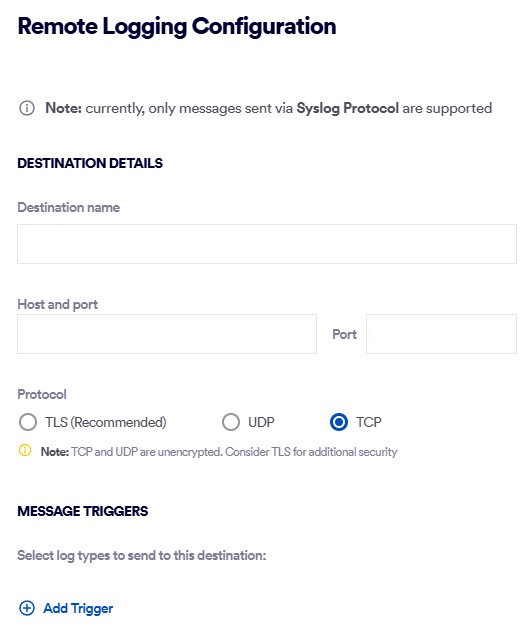 There are 3 available communication protocols for sending FortiMail Workspace Security messages: TLS, UDP, and TCP.