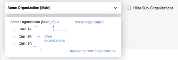 The number of child organizations in a parent organization is shown inside brackets - on the right of the parent organization name.
