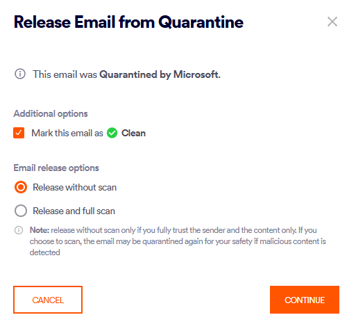 Note: If the "Mark this email as clean" option above is selected, the email will be given a clean verdict, and released from quarantine, irrespective of the verdict of the FortiMail Workspace Security scan.