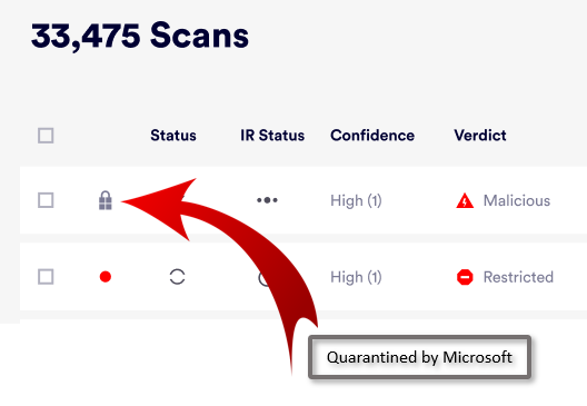 You can easily identify emails in the Scans page that were quarantined by Microsoft Defender. These emails have the "Quarantined by Microsoft" icon [