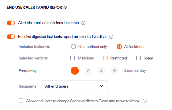 When enabled, if one or more of the verdict types [malicious, restricted, and spam] is selected, Digest reports will be sent. The Digest reports include a list of the incidents that occurred since the previous Digest reports were generated. Only emails and files with the selected scan-verdicts are included in the reports.
