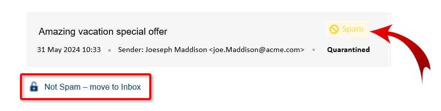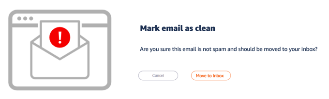 End-user experience: When an end-user clicks the "Not Spam - move to Inbox" option, the user will be redirected to a web-page where the user can confirm that the email is clean and should be moved to the Inbox.