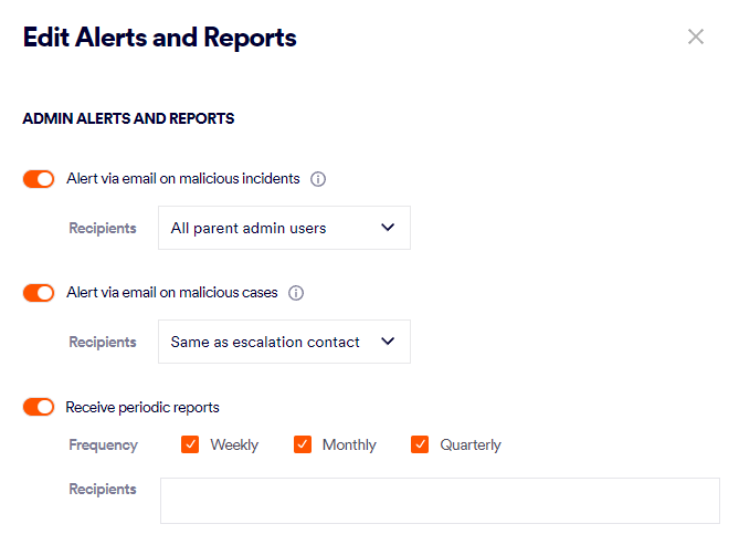 However, by configuring the reports on the parent level, the specified admin users will receive reports regarding all of the child organizations.