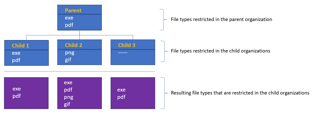 All file types that are restricted [blocked] in a parent organization are restricted [blocked] in all the child organizations.
