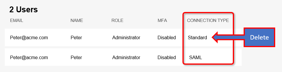 To see a list of admin users and the type of each user, go to the Settings > Admin Users page - and look for the Connection Type [Standard or SAML].