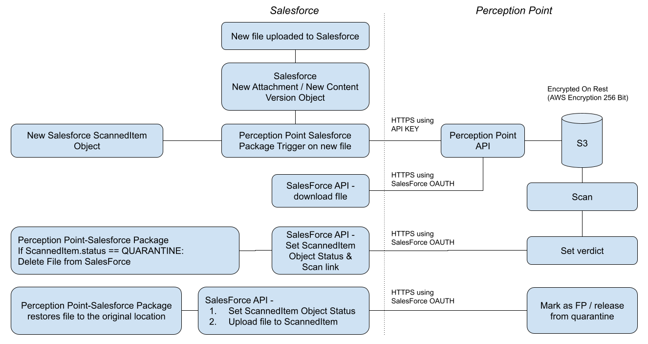It is possible to configure the FortiMail Workspace Security-Salesforce integration to quarantine files. By default, a file will be quarantined when a scan assigns a malicious verdict to the file, or when the FortiMail Workspace Security IR Team changes the verdict of a scan to malicious. When a file is quarantined, it is deleted from Salesforce, and a copy of the file is stored on Fortinet servers - for recovery purposes. It is not possible for users to access or download a quarantined file.