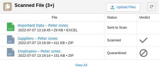 You can add the FortiMail Workspace Security component to any Salesforce record page. The FortiMail Workspace Security component shows details of the FortiMail Workspace Security scans that were performed on all uploaded files that are related to the specific Salesforce record, in any of the objects. The details shown include the scan status and the scan verdict.