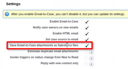 To enable the "Save Email-to-Case attachments as Salesforce files" setting: