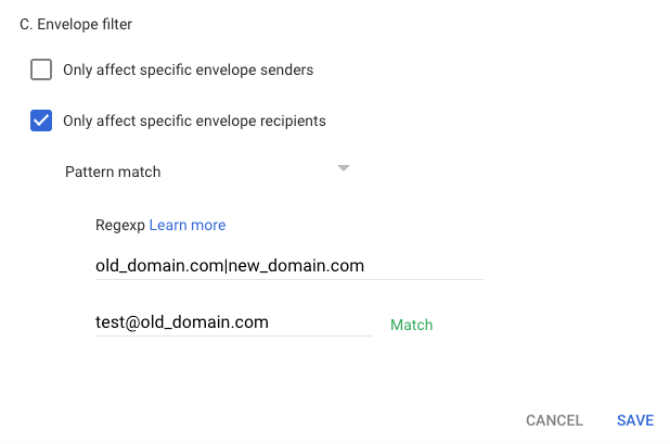 Under C. Envelope filter > Only affect specific envelope recipients > Pattern match